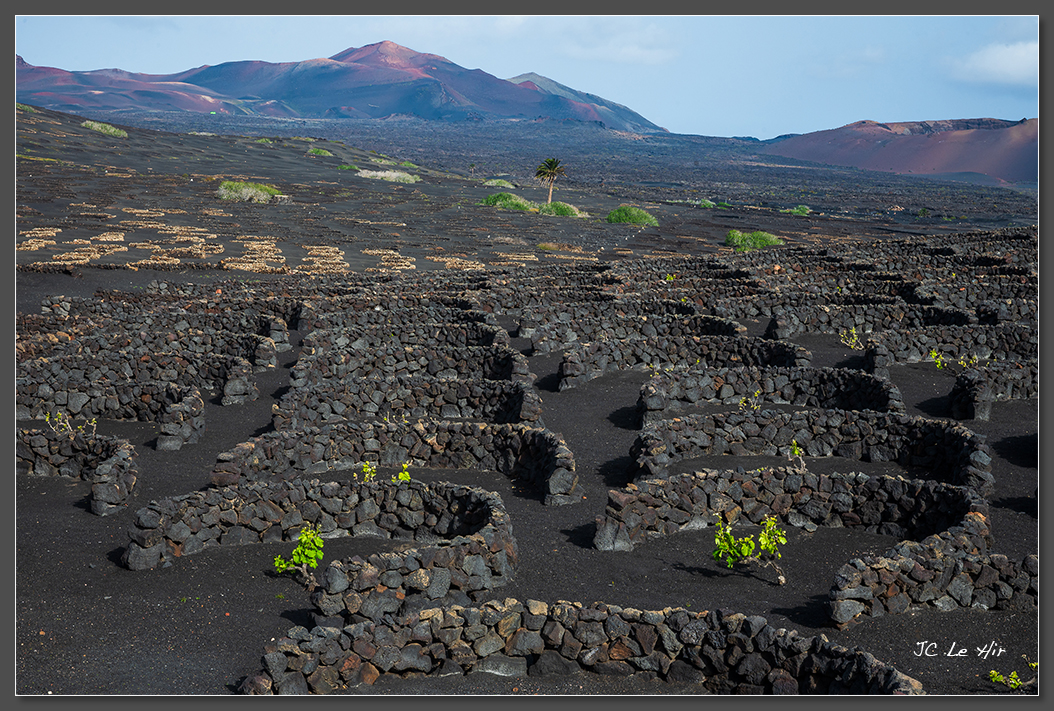 ... et pour protéger les plants de vigne contre les vents fréquents, des murets de pierre volcanique ont été érigés faisant office de pare-vent.