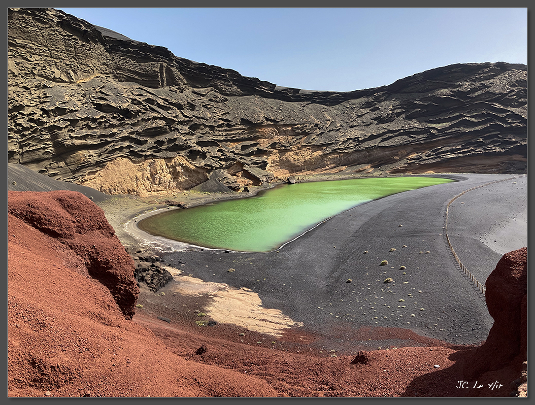Au creux d'un cratère volcanique à moitié englouti dans l'océan, la lagune sursalée de Charco de los Clicos doit sa couleur verte à la présence de plantes herbacées aquatiques (Ruppia maritima).