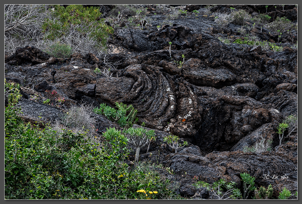 Telle une couverture que l'on repousse, la lave basaltique en se refoidissant peut présenter ces structures cordées que les HawÏens ont nommées pähoehoe.