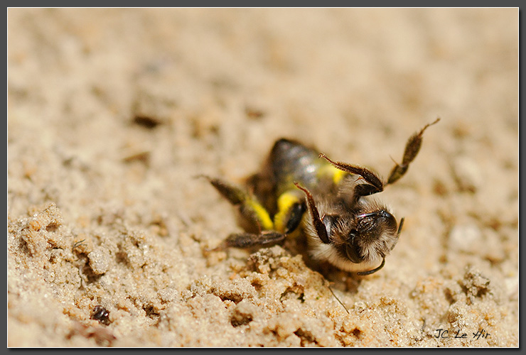 Cette Andrène (Andrena vaga) encore chargée de pollen semble bien faible et ne pas pas tarder à mourir.