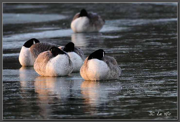 L'hiver 2012 est rude, les étangs sont gelés. Pensent-elles à leur pays d'origine en dormant à même la glace ces Bernaches du Canada (Branta canadensis) ?