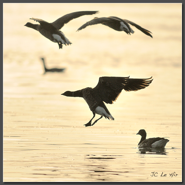 Bernaches cravant (Branta bernicla) dans la belle lumière du golfe du Morbihan.