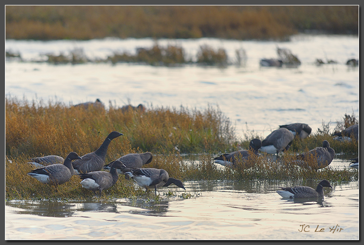 Dès les premières neiges tombées sur la toundra, les Bernaches cravant (Branta bernicla) quittent les régions circumpolaires et séjournent sur les rivages du golfe jusqu'en février-mars.