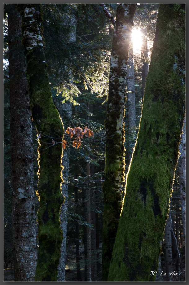 Hétraie-Sapinière inondée de soleil matinal.