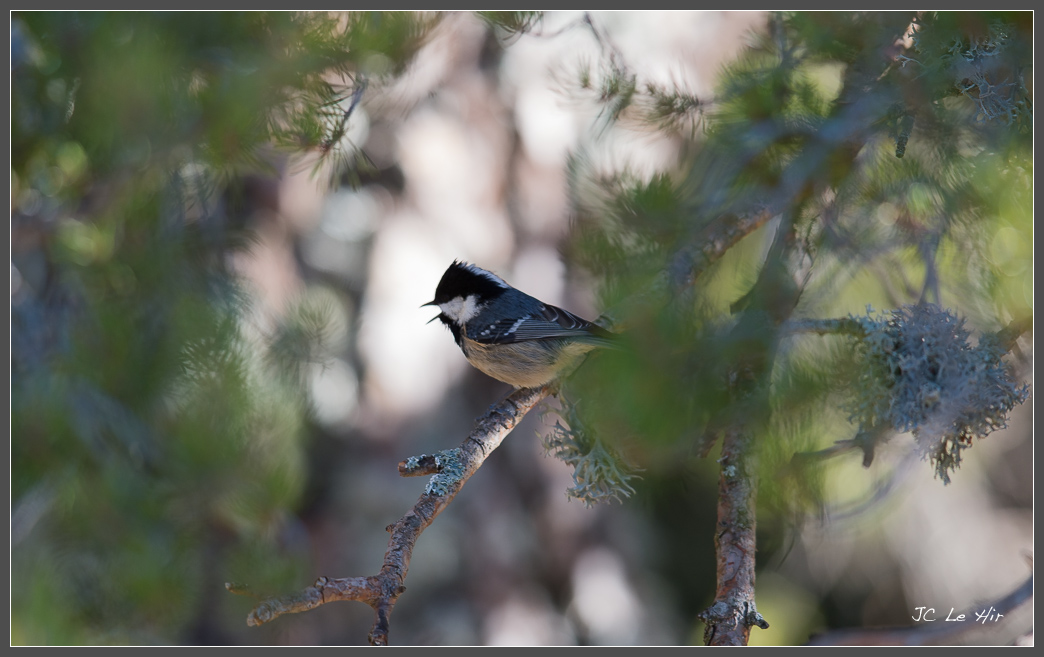 Dans une trouée de la frondaison d'un Pin à crochets, la petite Mésange noire (Peripatus ater) chante à tue-tête.
