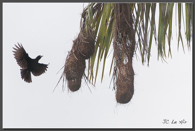 Cassique à cul rouge (Cacicus haemorrhous) venant se poser sur son nid spectaculaire.