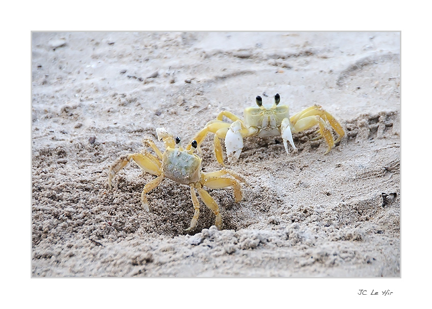 Couple de Crabes fantômes (Ocypode quadrata) s'aventurant hors de leur terrier mais prompt à s'y réfugier.