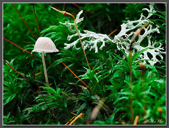 | Émergeant tout juste des pieds de la Mousse (Atrichie ondulée - Atrichum undulatum), un pied de Mycène des Fougères (Mycena epipterygia) pointe le bout de son chapeau. |