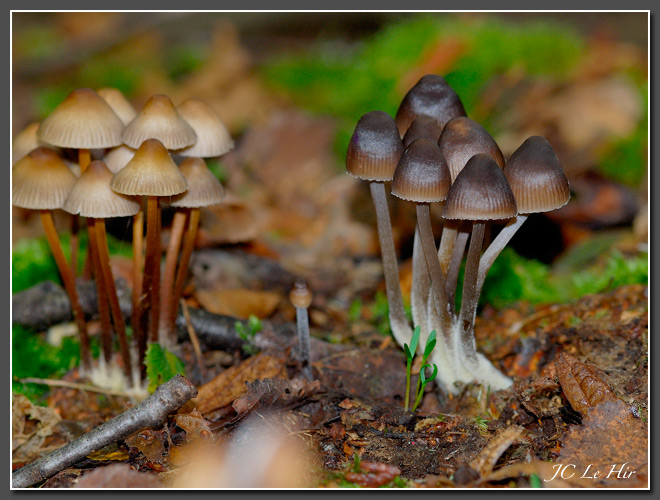 | Les Mycènes inclinées (Mycena inclinata) croissent en touffes serrées sur les vieilles souches, au pied des arbres, souvent des Chênes. |