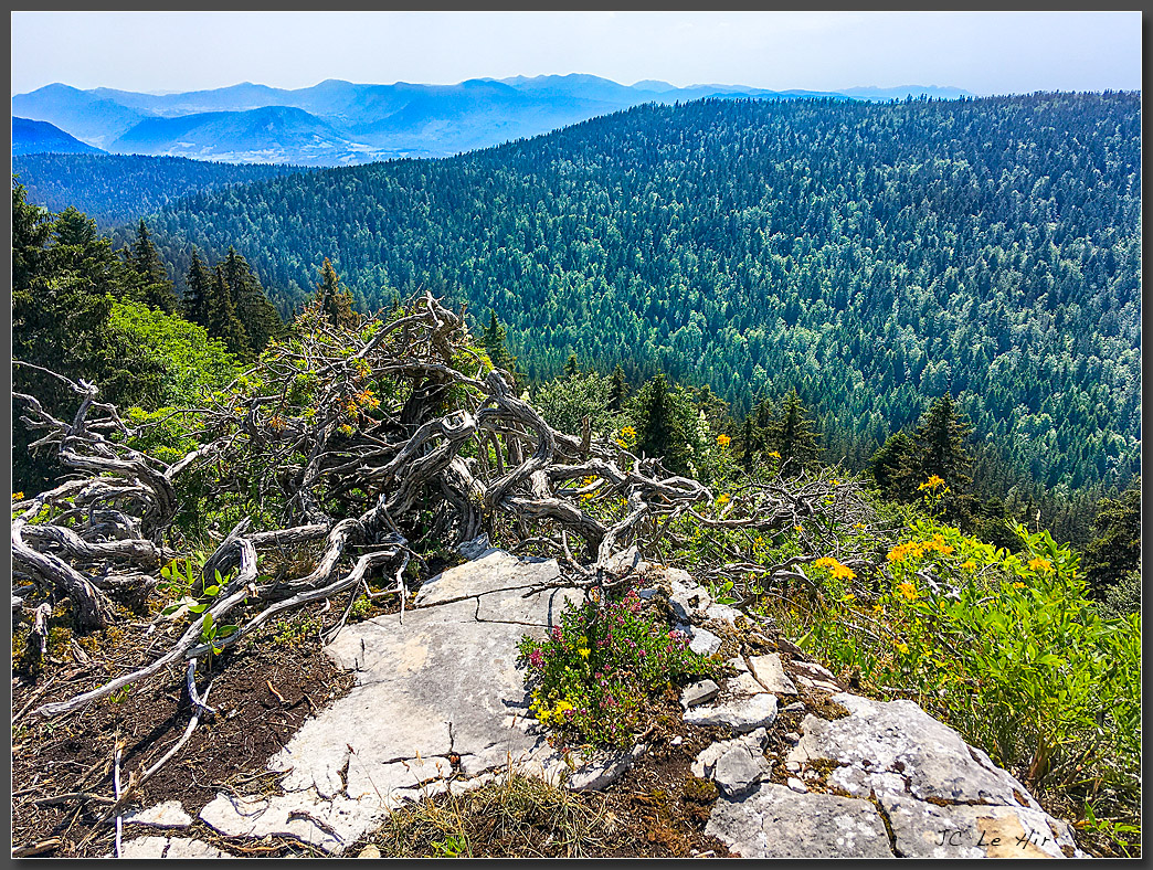 Au sommet du Belvédère de Chateau-Julien, apparaissent au delà de la forêt de Chalimont les Hauts-Plateaux du Vercors.