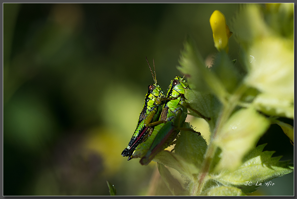 Accouplement de Miramelle subalpine (Miramella subalpina - Orthoptères).Le mâle est plus petit.