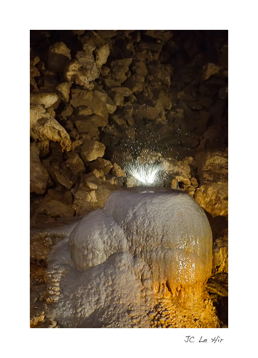 Splash après splash, la goutte d'eau dépose le carbonate de calcium qu'elle contient sous forme de lamine de calcite et contribue lentement, très lentement à la croissance de la stalagmite.