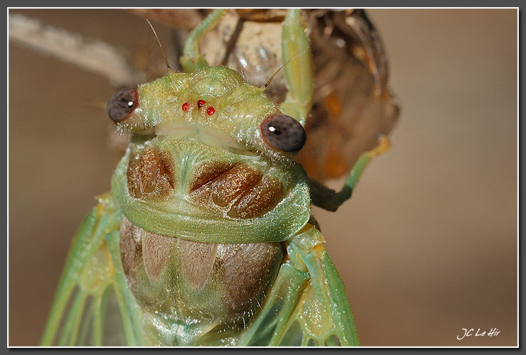 | Durant 2 heures, accrochée à sa dépouille, ailes pendantes, parée de ses 3 rubis en guise d'ocelles, la jeune cigale patiente. Voir et écouter la Vidéo. |