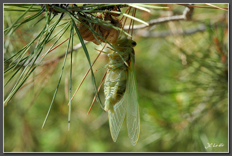 Tout près, dans un pin voisin, une autre cigale termine aussi sa mue imaginale. Voir et écouter la