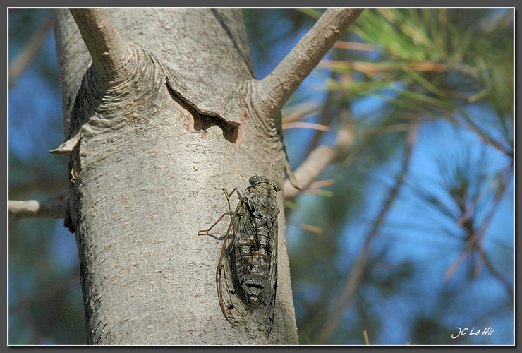 | Pas facile d'observer la cigale ? À la moindre alerte, elle s'envole ? Alors, approchez lentement du tronc de ce pin et scrutez attentivement la surface de l'écorce en direction du concert de cymbales. |