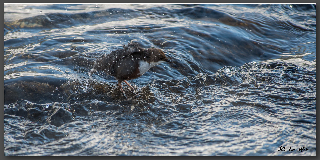 A la sortie d'une phase de pêche en apnée dans les eaux vives et tumultueuese du ruisseau, le Cincle (Cinclus cinclus) s'envole à grande vitesse au ras de l'eau et part exploiter une autre portion de son territoire.