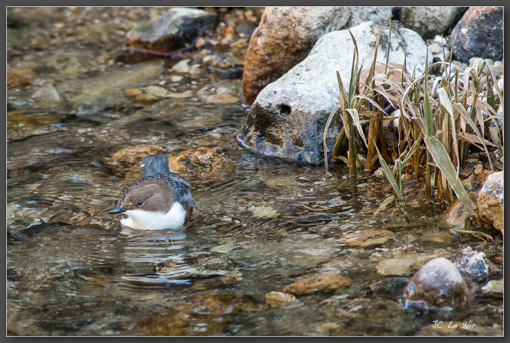 Le Cincle (Cinclus cinclus) n'hésite pas à plonger dans le ruisseau et à retourner de sa tête les cailloux en quête de nourriture: petits crustacés, larves d'insectes, mollusques et petits poissons.