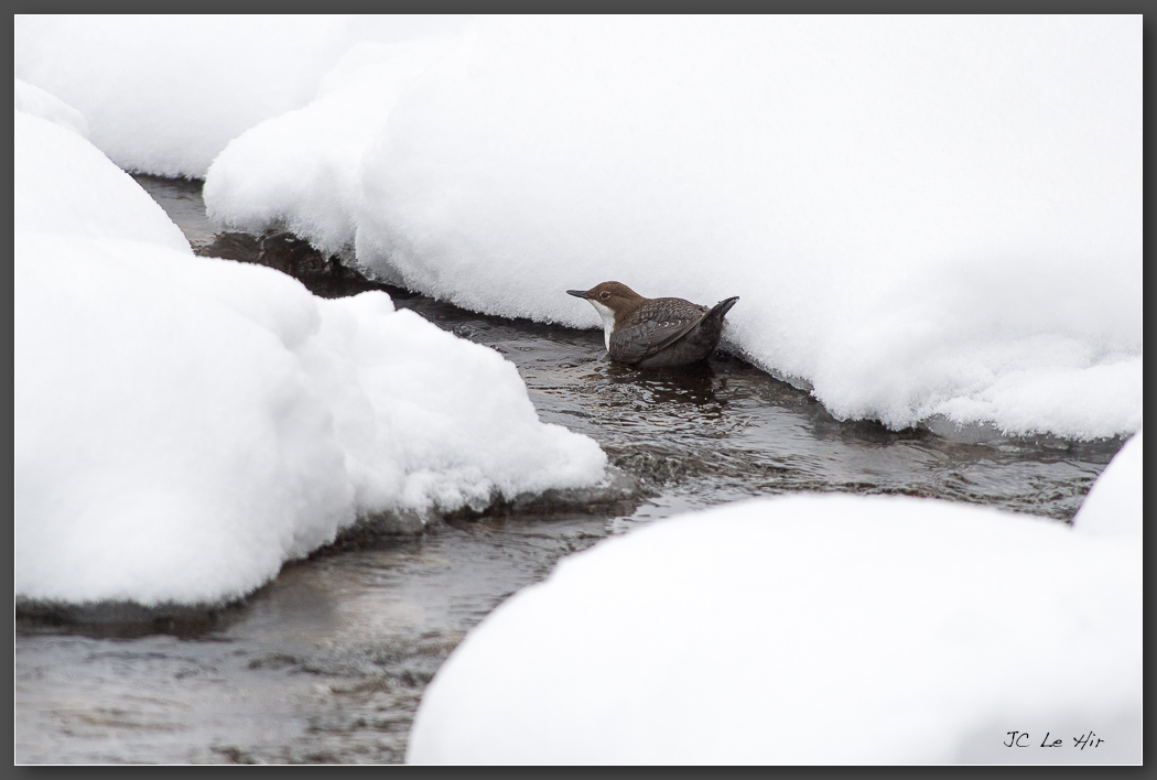 Le plumage particulièrement étanche du Cincle (Cinclus cinclus) lui permet de pêcher en pleine eau au plus fort de l'hiver.