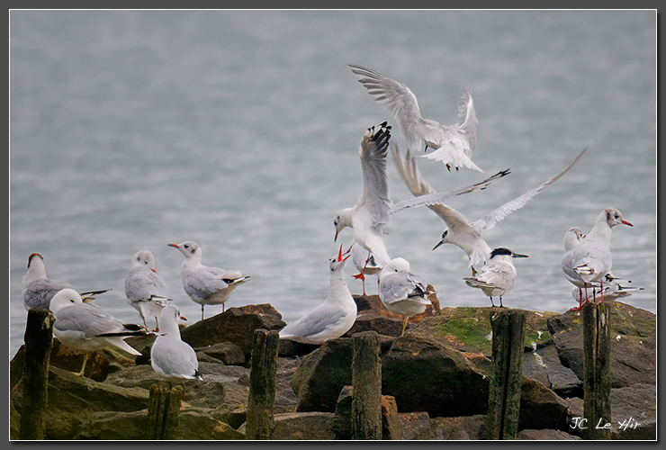 À marée haute, cet ancien parc à huîtres est convoité par bon nombre d'espèces d'oisaux marins qui trouvent là un reposoir. La colocation y est plus ou moins facile!