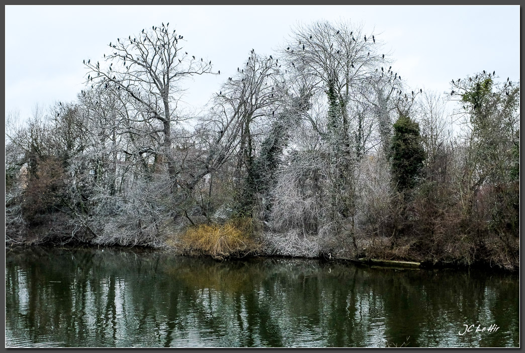 Reposoir de Grands Cormorans (Phalacrocorax carbo) en bord de Marne blanchi par les fientes des oiseaux.