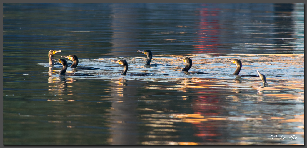Groupe de Grands Cormorans (Phalacrocorax carbo) pêchant ensemble sur la Marne.