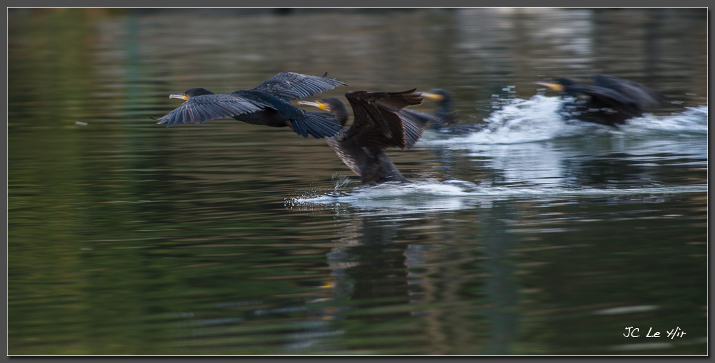 Qu'un bateau s'approche et tout le groupe des pêcheurs s'envole. Le Grand Cormoran (Phalacrocorax carbo ) est d'un naturel craintif.