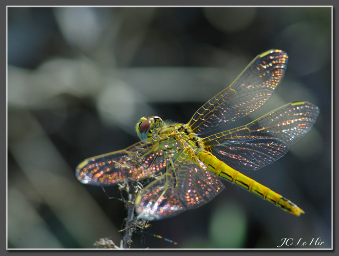 | S'écartant des zones humides de sa naissance, le Sympétrum de Fonscolombe (Sympetrum fonscolombii femelle - Odonates) s'aventure pour chasser sur le coussous. |
