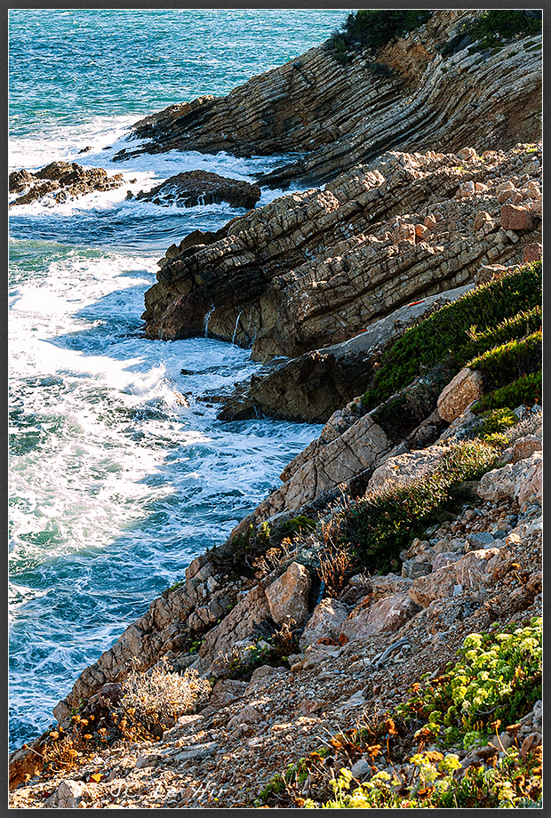 Entre les bancs de calcaire plongeant dans la mer, diverses plantes parviennent à s'installer dans cet habitat si exposé aux embruns, au mistral et à la sécheresse.