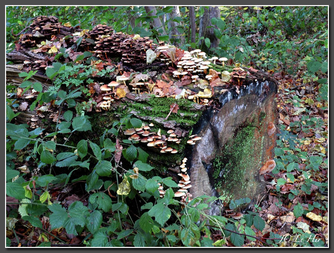 | Suite à la tempête de février 1999, des chênes, des hêtres déracinées ont été débités et les tronçons abandonnés sur place dans cette parcelle forestière. Cinq ans plus tard, l'écorce se détache facilement, soulevons là délicatement ... |