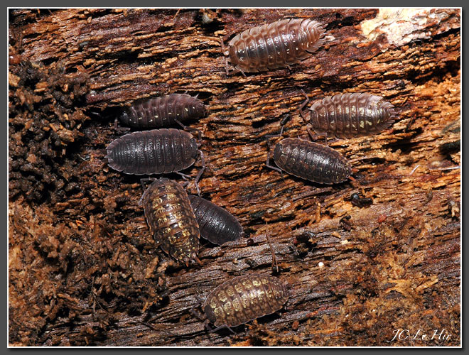 | Entre l'écorce et le bois, les Cloportes (Oniscus asellus - Crustacés Isopodes) trouvent l'humidité indispensable à leur respiration branchiale et également l'obscurité. |