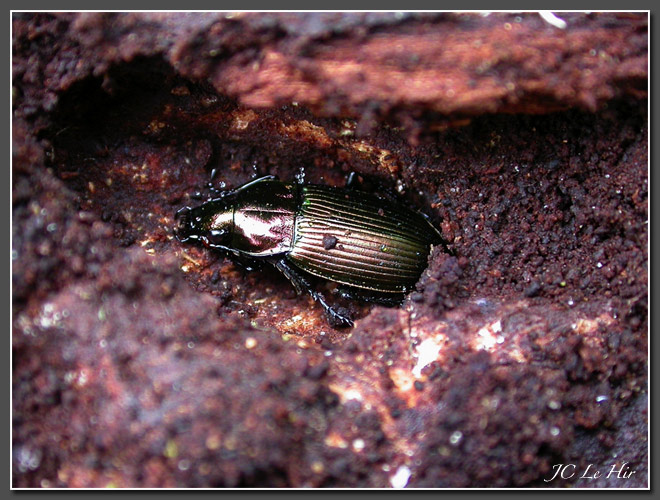 | Dans ce bois attendri par tous les xylophages , il a été facile à cet adulte de Ptérostichus cuivré (Pterostichus cupreus - Coléoptères) de se ménager une logette pour hiverner. |
