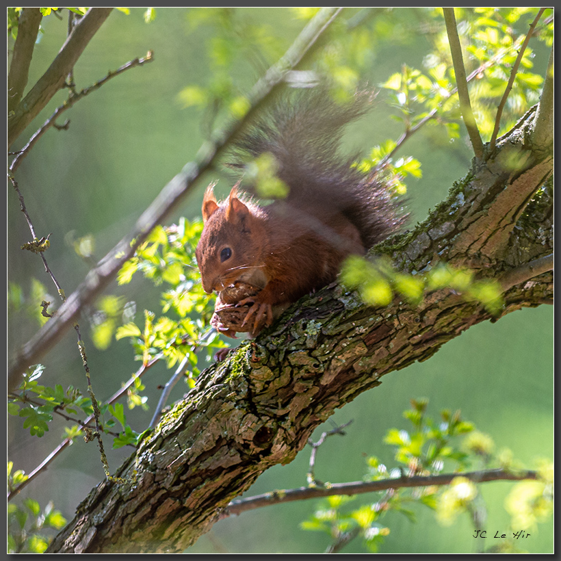 Tranquillement installé sur une branche, l'Écureuil (Sciurus vulgaris) consomme de nombreuses graines et fruits secs.