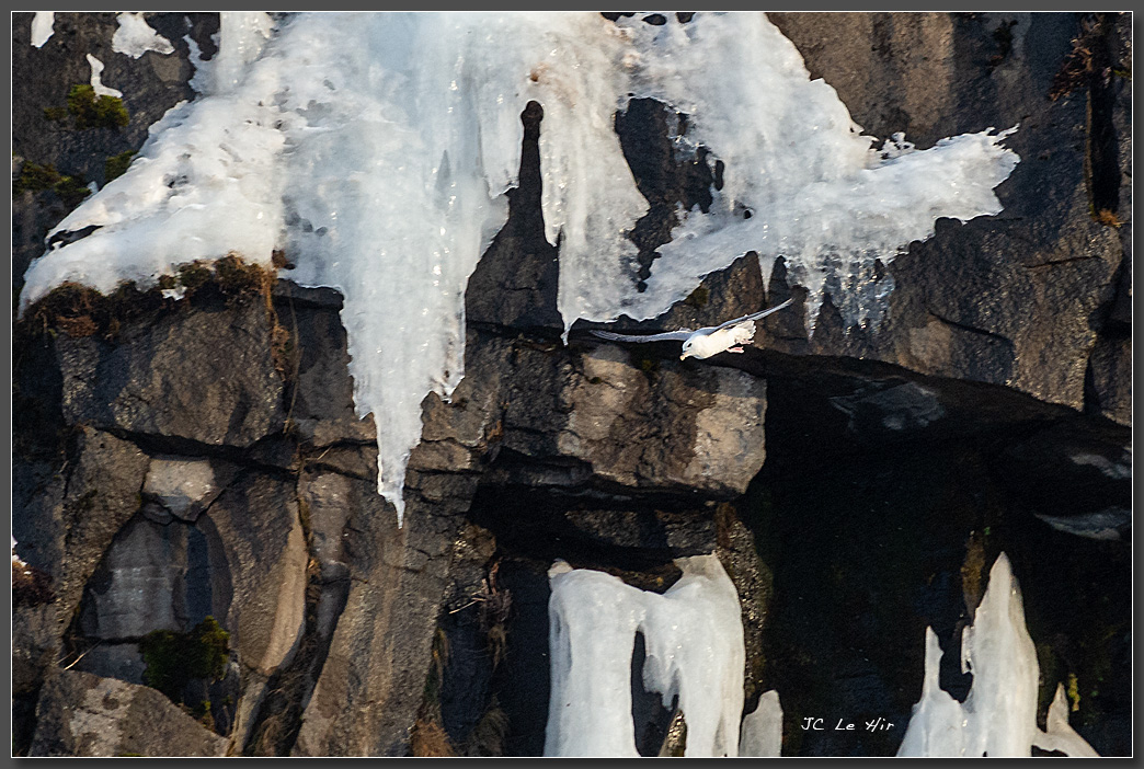 Vol d'un Fulmar boréal (Fulmarus glacialis) le long des parois d'une cascade glacée.