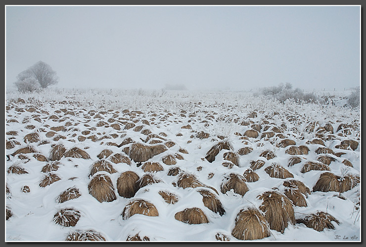 | Dans les parties humides des rives de la Bourne, neige et givre donnent un modelé très original aux touradons de Carex (Carex sp.- Cypéracées). |