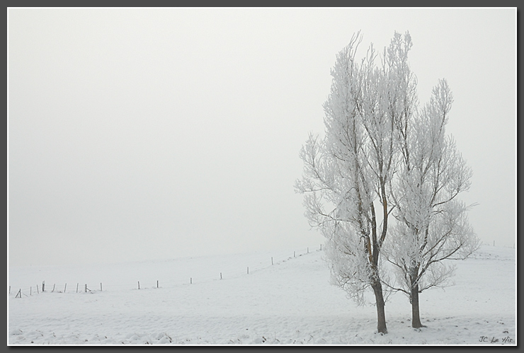 | Le brouillard givrant est épais. Les limites du ciel et de la terre s'estompent. Ainsi se créent de magnifiques ambiances hivernales. |
