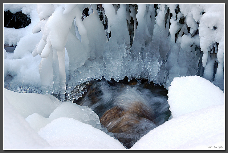 Frayant son chemin entre les rochers couverts de neige, la Fauge se laisse apercevoir par endroits.