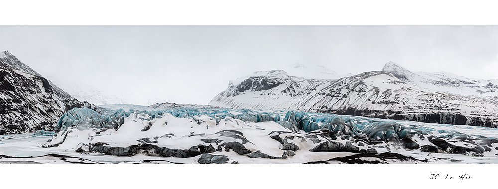 La langue glaciaire du glacier Vatnajökull s'avance entre les reliefs basaltiques.