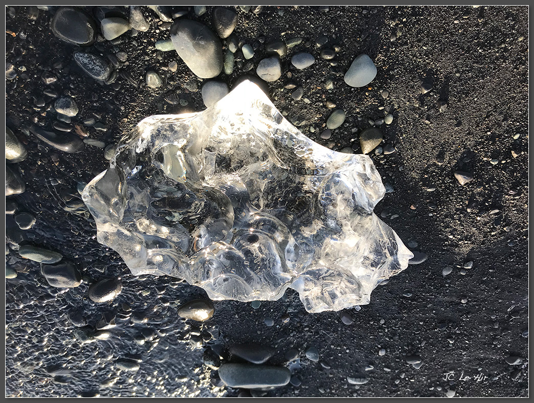 Un magnifique "diamant" de glace posé sur le sable noir basaltique !