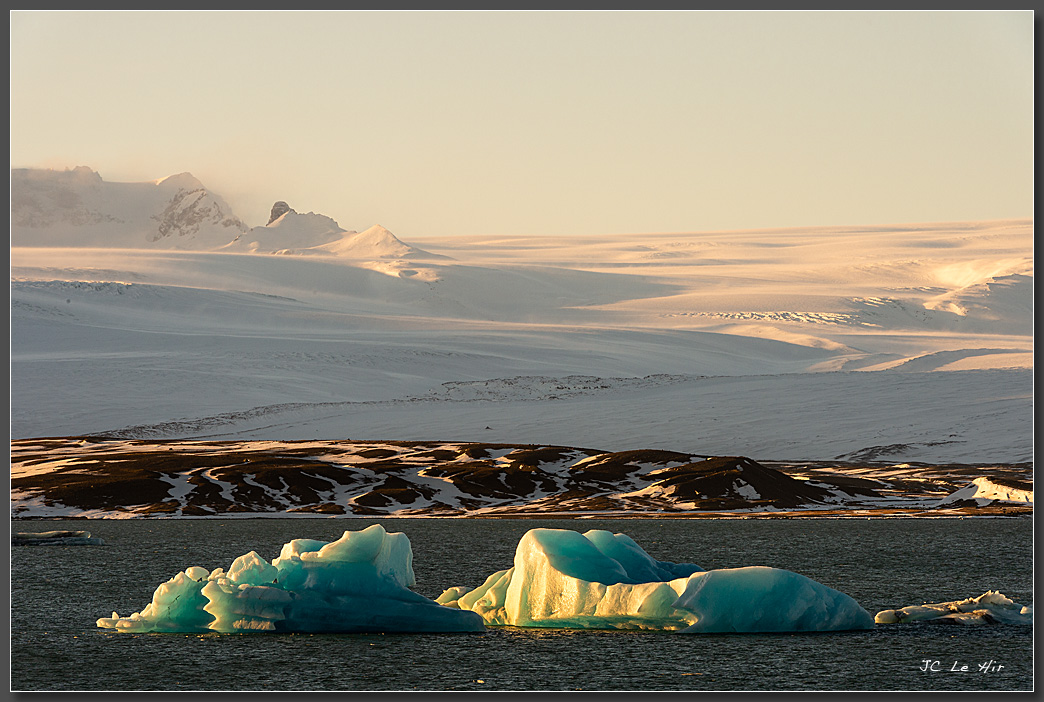 Deux growlers imposants dans le soleil couchant. En arrière plan, au-delà de la moraine, l'imposant glacier Vatnajökull.