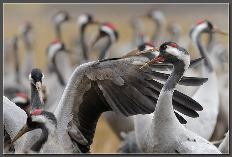 Les nombreuses Grues cendrées (Grus grus) sont venues se nourrir sur le champ agrainé par la LPO.