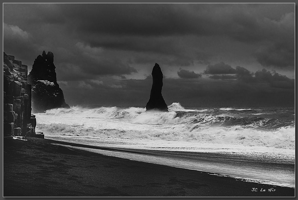 Plage noire de Reynisfjara. Aiguilles de basalte de Reynisdrangar.