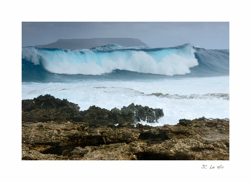 Houle à la Pointe des Châteaux. Au loin, l'île de la Désirade.