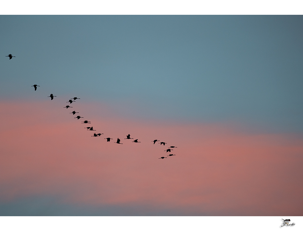 Groupe de Grues cendrées quittant le Lac du Der (51) pour rejoindre les zones de gagnage alentour ou entamer la route du Sud qui les mèneront vers l'Espagne.
