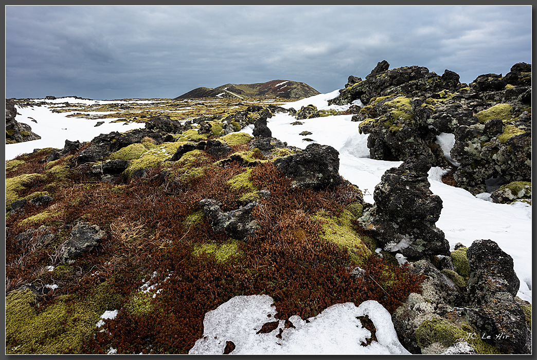 Champ chaotique de blocs de lave basaltique que des mousses et végétaux rabougris recouvrent. Au loin le volcan, au cratère égueulé, qui les a sans doute expulsées lors d'éruptions.