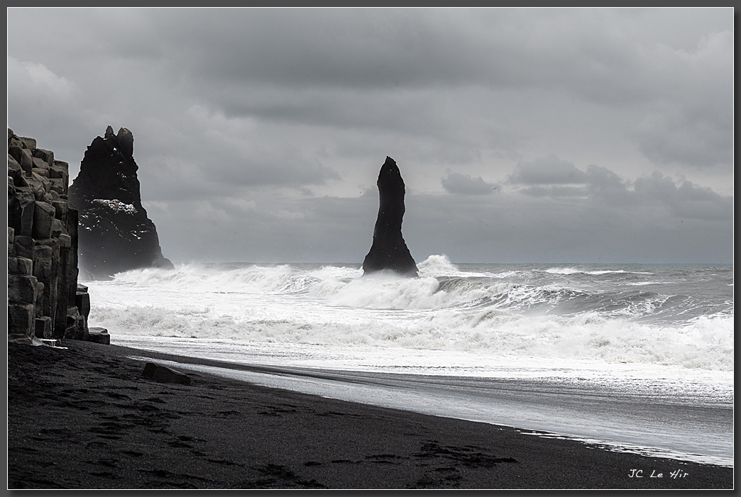 Au bord de la plage noire de Reynisfjara, les aiguilles de basalte résistent aux puissantes vagues de l'océan.