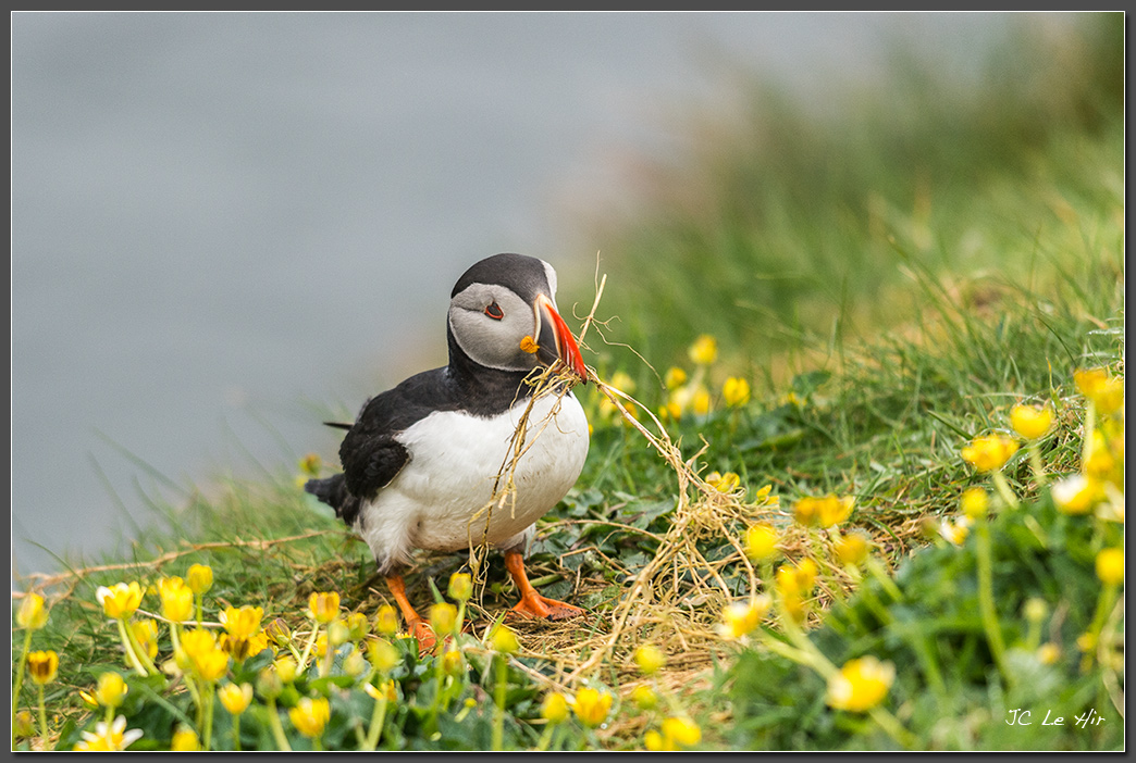 Le Macareux moine (Fratercula arctica) s'apprête à enfourner ces herbes sèches au fond de son terrier.