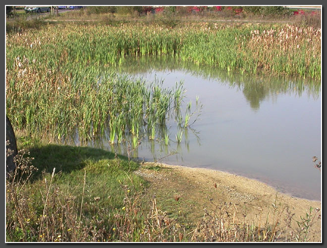 | Quelques années ont suffit à transformer le petit bassin de rétention d'eau créé lors de la mise en place d'un giratoire en une mare colonisée par une flore et une faune diversifiées. |