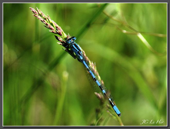 | À la différence des Anisoptères (type Libellule ou Orthétrum), les Zygoptères (ici un mâle d'Agrion porte-coupe Enallagma cyathigerum), autre grand groupe d'Odonates, se reconnaisent à leur capacité de placer leurs ailes au repos le long de l'abdomen. |