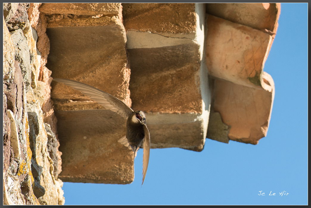 Le Martinet noir (Apus apus) quitte son nid en lançant ses cris stridents.