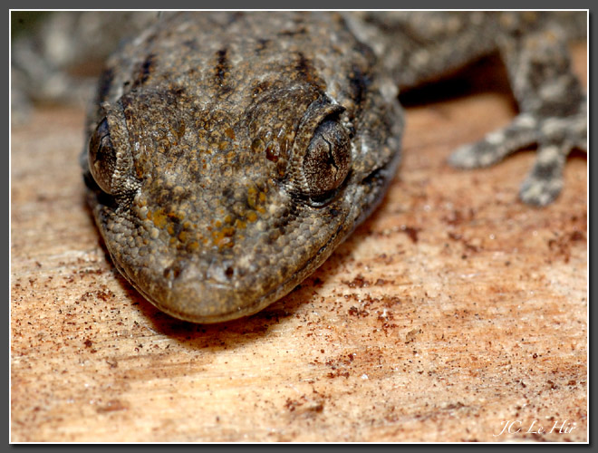 | Février 2006 : Bien caché sous l'écorce déhiscente d'une souche morte de Pin, le petit Gecko des murs (Tarentola mauritanica) rêve aux chaudes soirées estivales. |
